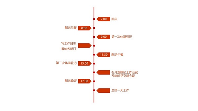 这样的流程,于老师和他的“战友”们重复了14天。随着工作的推进和对疫情认识的不断加深,他越发意识到设立健康观察区的关键性。他知道,自己必须冲锋在前。“每天必须把所有的工作都干完了,再准备好明天的事,不能拖延。这里也没严格的工作时间与休息时间的区分,工作是休息,休息也是工作,休息好了才能更好地服务。”