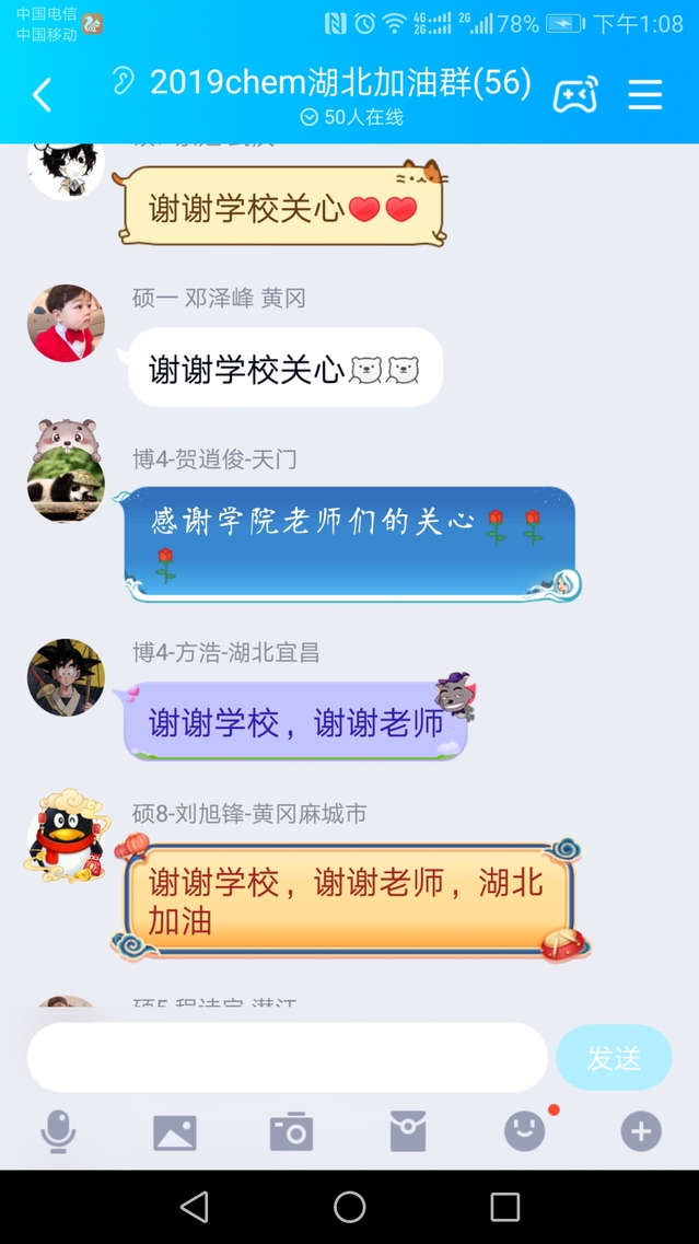 面对越来越严峻疫情防控形势,学院留校同学中的15名党员,自发成立了留校学生临时党支部。此外,响应学院党委号召,学工组还组织成立了4个在鄂学生临时党支部。在学院党委领导和学工组具体指导下,临时党支部党员利用电话、网络平台,创新工作方式,协助学工组工作,做到信息畅通、全员覆盖,传递关爱、传播知识;支部党员还克服自身困难,积极承担学校学院备物资、贴封条、寄口罩、做翻译等工作,精准对接有需要的同学,解决实际困难。学生临时党支部在新春佳节之际为校园疫情防控工作站好了关键岗位,维护了留校学生群体的安全稳定,给予身在疫区的学生以心理支持,并通过学生党员的先锋模范作用,彰显了党组织的力量和温暖,凝聚了化院人心、增强了必胜的信心。
