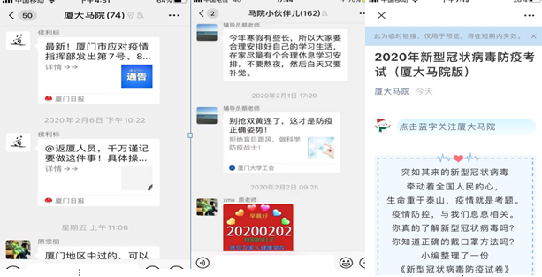 战胜疫情,信心很重要,准确的信息也很重要。在院党委领导下,学院信息联络员、各临时党支部、抗疫预备队能够全天候关注中央和学校的部署要求,充分利用学院微信群、公众号等网络手段,及时在全院师生中传达有关通知精神,宣传防疫知识,加强防疫教育和舆情引导,让师生响应中央号召,主动配合所在地和学校防疫要求,做好自我防护,稳定情绪,不信谣、不传谣,让大家紧密团结在院党委周围,共筑战胜疫情的信心长城。