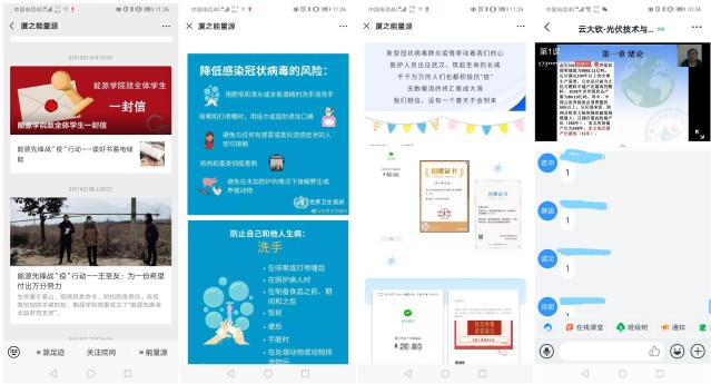 院党委积极开展防控疫情的宣传工作,线上线下联合,传播众志成城抗击疫情的正能量,引导广大师生增强战胜疫情的信息和决心。学院网站第一时间建立“疫情要闻”专栏,官方微信平台定期推送科学防疫宣传知识,科普抗疫常识;学院疫情防控领导小组向教工党员发出“到社区报到向社区请战”活动倡议书,能源先锋战“疫”党支部发布《致全体能源学子一封信》;师生党支部充分运用厦门“党建e家”、学习强国、微信群等平台,以“固定党日+”、政治理论学习等形式组织师生党员开展线上学习研讨,营造万众一心共抗疫情的良好氛围。
