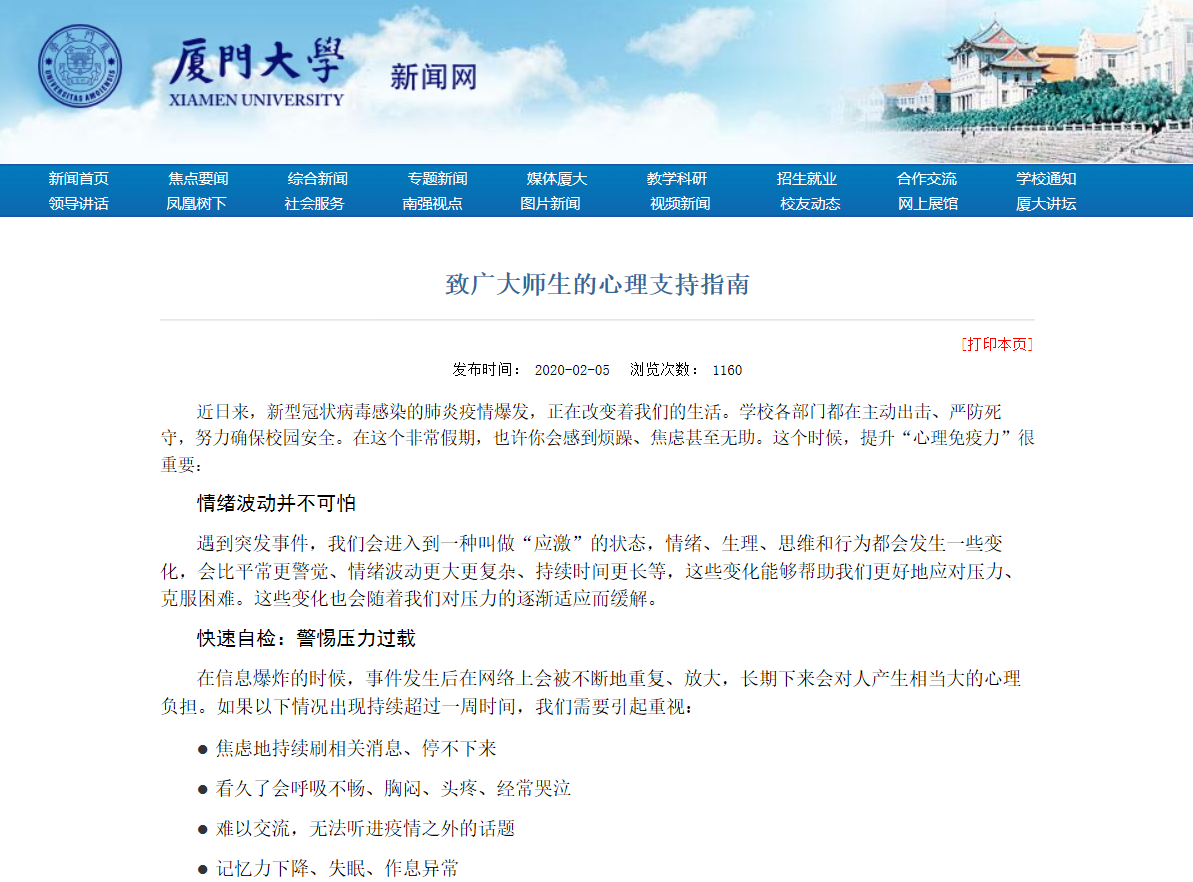 提供专业心理支持。心理战线是这场没有硝烟的战争的另一个战场,心理咨询与教育中心通过厦门大学新闻网发布《致广大师生的心理支持指南》,随后学工系统各单位积极部署、广泛转发,为广大师生注射提升“心理免疫力”的强心针;中心老师轮流值班,保证两部校内心理支持热线持续开通,一部热线面向全校师生进行特殊时期心理疏导,另一部则针对健康观察区学生,提供24小时一对一心理援助;同时中心拓展网络援助渠道,利用电子邮箱和“厦大心理咨询与教育中心”和“厦大阳光”微信公众号留言提供咨询服务。中心的老师们默默为这次特别的服务立了一个宗旨——心心念念。开学延期,不少毕业班学生为就业担忧,学生处积极统筹协调疫情期间毕业生就业创业工作,针对毕业生普遍关心的校园招聘、就业指导、手续办理等关键问题,一一提出具体的解决方案,为毕业班学生送上一颗“定心丸”。