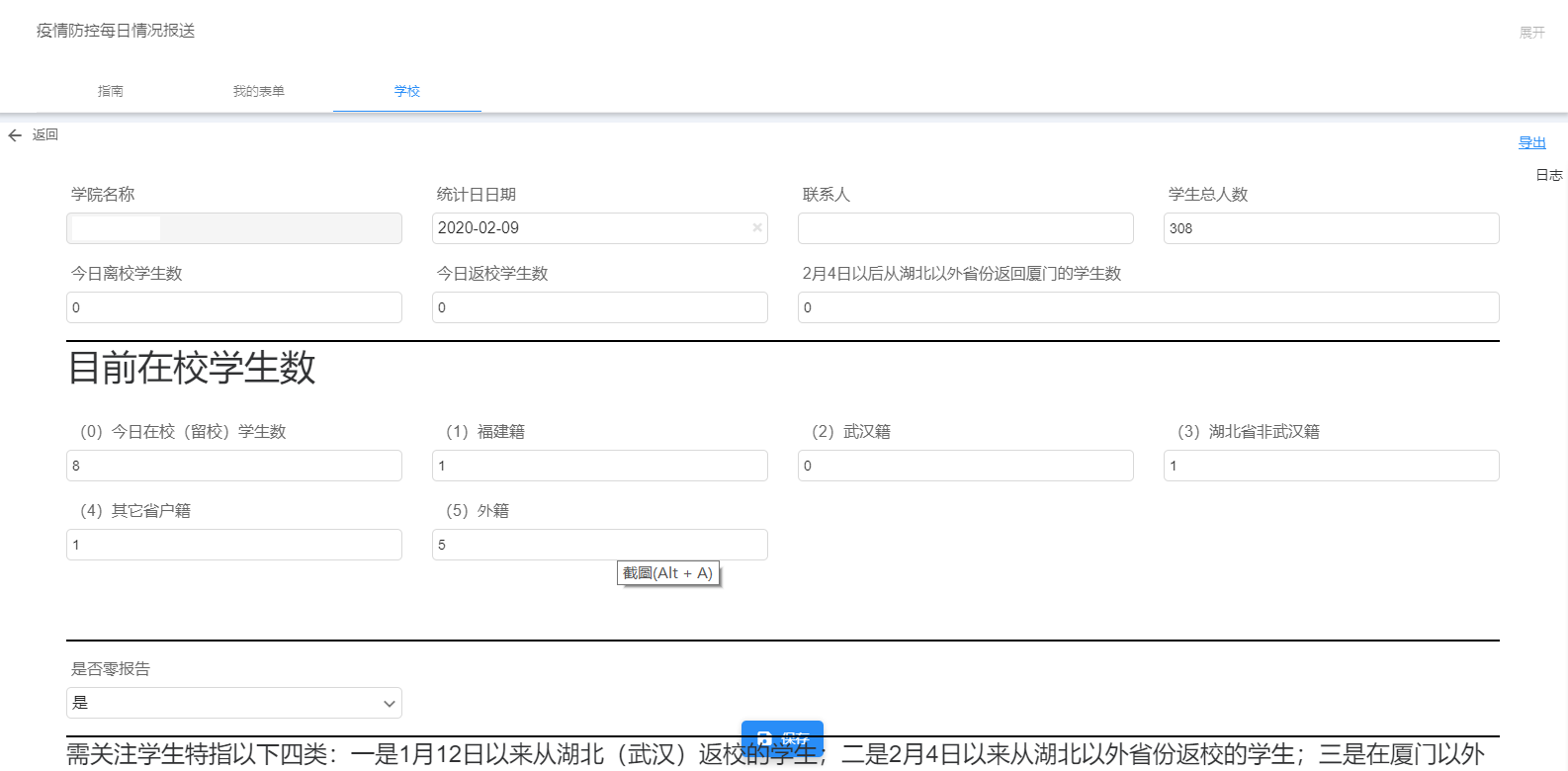 全面进行学生每日健康监测。“疫情防控战”打响后,学生工作处第一时间开发配置学生工作系统信息采集模块,为准确快速收集、统计、分析学生基本信息、健康信息和动向信息提供技术支持,铺设便捷通道。学生处管理科科长刘俊英取消了寒假返乡计划,连续20多天奋战在学工系统联络员岗位上,就连除夕夜也是在工作中度过的,她用这份坚守,为学校疫情防控工作提供了重要的信息支撑。