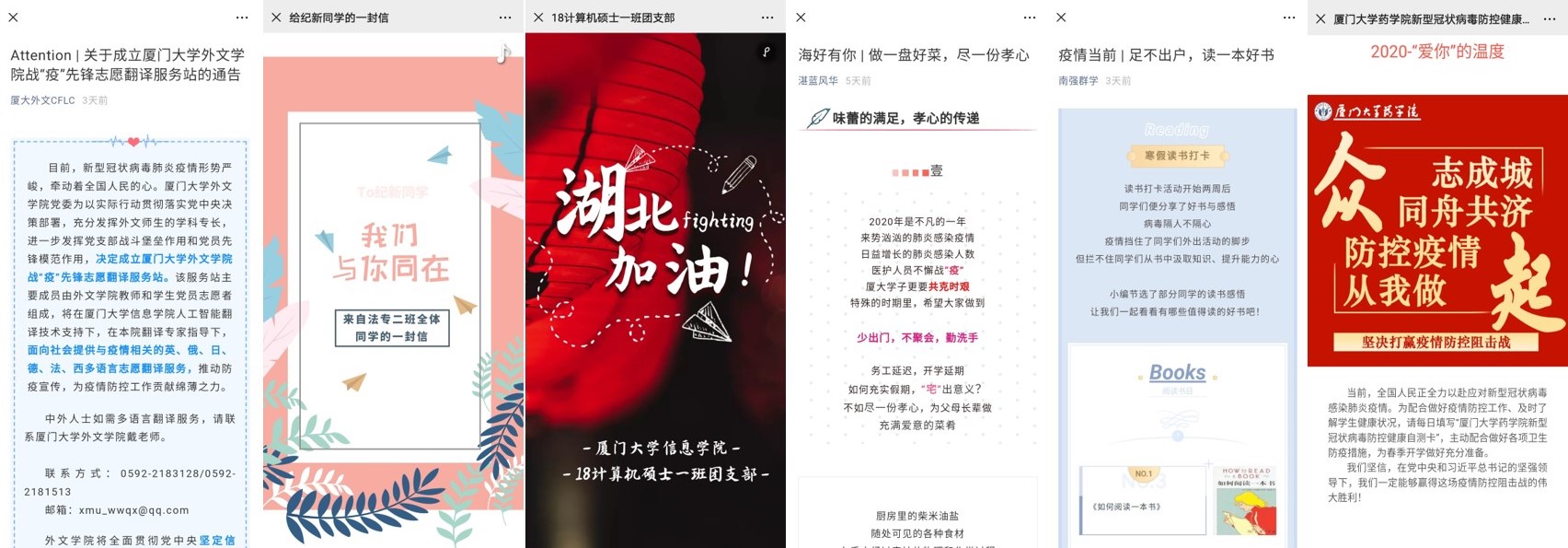 开展共克时艰思想教育。用一封封倡议书、承诺书树立大局观念,用一次次科学知识的发布击碎谣言,用一个个战“疫”英雄的故事唤起责任与担当,前有“我现在下车,回武汉,去医院”的我校医学院毕业生、最美逆行者吴小艳,后有用人单位发来表扬信点名表扬在防疫工作中表现突出的我校教育研究院毕业生寇瑜,思想教育成果也从中得到彰显。面对疫情,信心是长效的疫苗,校团委充分运用绘制图片、创作H5、录制MV、拍摄视频等生动的新媒体传播方式,制作专题推送,增强学生信心。校团委微信公众号青春厦大、厦门大学青春飞翔、团聚嘉园累计推出专题推送51篇,近12万阅读量。“热干面加油”手绘图、师生唱响的《奉献》MV、艺术团原创诗朗诵等都以特别的形式传达着深情。为发挥学生专长,为打赢防疫战加油鼓劲,校团委发起“艺术战‘疫’作品征集”,通过各类媒体平台面向青年和教职工征集各类防疫抗疫艺术作品,截至目前已收到来自三个校区近70份作品。