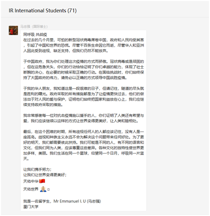 “于中国政府,我为你们处理这次疫情的方式而骄傲……你们的行动证明了你们卓越的能力……始终保持着大国政府的伟力”远在尼日利亚的国际博士生马志强在了解了中国政府强力高效、扎实有效的防控措施后,通过网络社交平台向全体留学生发出“相信中国,同呼吸,共战疫”的强烈倡议。“Be courageous Be strong Be safe”