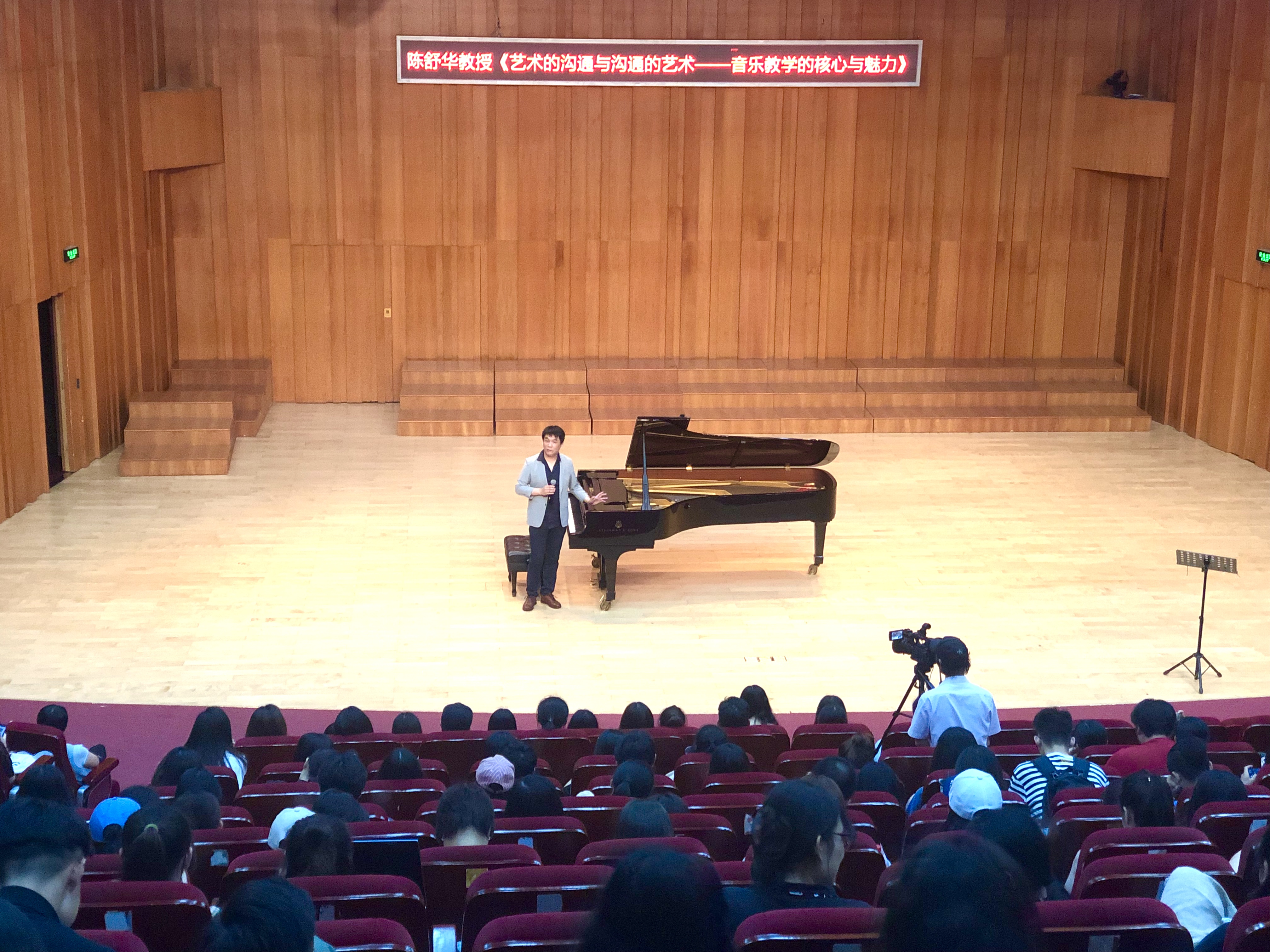 此外,陈舒华也是一位颇具教学魅力的老师。能选上他的课,成为他的钢琴专业学生是一件让同学们感到十分幸运和荣耀的事。他的大课常常会伴以同学们的掌声结束,他的钢琴专业课也时常吸引很多兄弟院校的老师们前来旁听记录。陈老师非常善用各种方法和比喻来引导学生关注音乐本质问题。他幽默风趣的语言、精炼独到的角度、富有哲理的话语都让学生印象深刻。