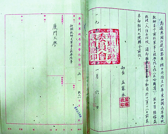 1952年,抽调厦门大学教师赴哈尔滨军事工程学院的函件。