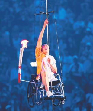 2008年9月6日,北京残奥会开幕式在“鸟巢”隆重地拉开帷幕。在全场数万观众的注视中,侯斌缓缓地上升到位于场地上空的主火炬台下。他手持“祥云”火炬,点燃位于主火炬台下方的引火装置。霎时一条火龙盘旋而上,点燃了北京残奥会的主火炬台。出生于佳木斯、获过三届残奥会跳高金牌,成长为优秀运动员、厦大新闻传播学院广告学专业学子侯斌,以这样的方式在残奥会历史上留下了浓重的一笔。而他一路走来,唱歌、修手表、学画画、当工人和担任北京申办冬奥会形象大使的自强故事,更是激励了无数厦大学子。