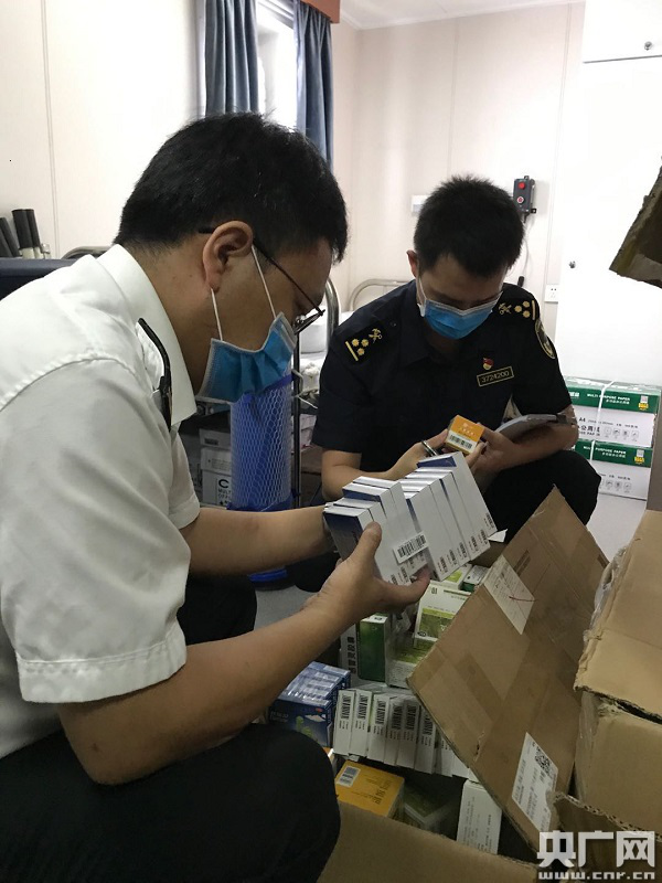 海关关员对船上物资进行查验(央广网记者 陈庚 摄)