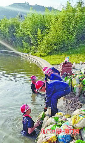 ▲厦大后勤水电员工在湖水中检修更换排水泵。