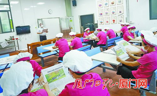 餐厅员工利用岗前一刻组织学习厦门日报刊登的关于厦大物业的报道《服务从心出发 师生业主齐点赞》。