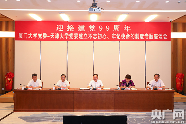 央广网厦门7月2日消息(记者陈庚 通讯员陈浪 庄华)为深入学习习近平新时代中国特色社会主义思想,贯彻落实党的十九届四中全会精神和中央关于建立不忘初心、牢记使命的制度要求,厦门大学党委和天津大学党委6月30日下午联合举办专题座谈会,以线上线下相结合的方式,交流研讨建立不忘初心、牢记使命的制度,共同探索进一步深化党建理论研究,推进高校党的制度建设,以一流党建引领一流大学建设。