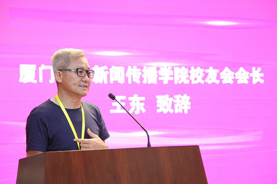 厦门大学新闻传播学院校友会王东会长在致辞之前朝着台下的学院老师鞠了三次躬,表达了他对学院老师的感恩以及重回母院的欣喜与忐忑。他结合自身工作经历,提出创新既是学院未来发展的路径,也是个人成长成才的阶梯。他鼓励在场学生,要坚定信念、坚持理想,更上一层楼。