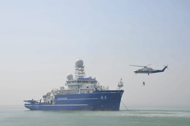 演练模拟“嘉庚号”科考船上有一名不慎摔伤的“伤员”。因为头部外伤,“伤员”已经意识不清,且体温异常。同行船员一边为“伤员”进行简单止血包扎,一边向东海救捞局第二救助飞行队(以下简称“东二飞”)求援。接到指令的直升机驶离厦门高崎机场,赶往厦门大学上弦场,接上专业医护人员后,又直飞“嘉庚号”科考船所在海域。直升机悬停在科考船上空后,机组人员先后将身穿防护装备的救生员与两名专业医护人员吊运到科考船的甲板上。救护人员联手为“伤员”进行心肺复苏等抢救。随后,被固定在担架上的“伤员”及救护人员被一一吊运回直升机机舱。