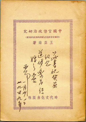 这部《中国官僚政治研究》是王亚南赠给郑启五的父亲郑道传的。在书的扉页有作者亲笔题签:“以此书祝贺并纪念道传学弟结婚之喜,亚南1949年1月31日”。值得一提的是,郑启五家藏的这部书还是上海时代文化出版社1948年10月首版,非常有纪念意义。