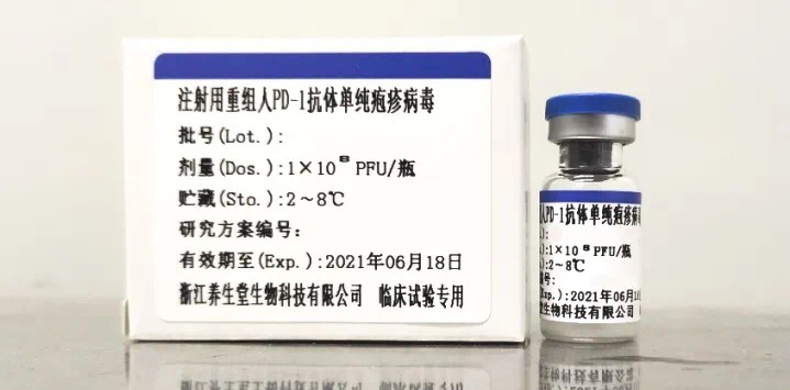 溶瘤病毒能对肿瘤细胞进行定向“溶解”,已成为肿瘤免疫疗法中重要的一员,但其疗效易受肿瘤免疫抑制性微环境的限制。为此,我国科学家研制出新一代肿瘤免疫治疗药物——“注射用重组人PD-1抗体单纯疱疹病毒”。