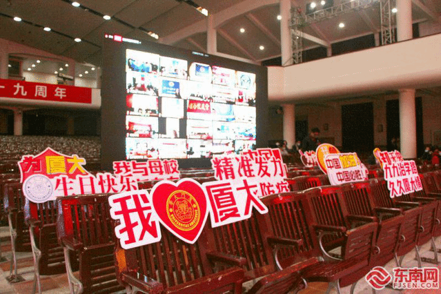 建南大会堂的座椅上,摆满了师生校友的祝福牌。大会开始前,各地校友会通过视频送上对母校的深情祝福。全体与会人员观看了由学校宣传部门制作的专题片,共同回顾近年学校改革发展取得的主要成绩,特别是新冠肺炎疫情发生以来全体厦大人众志成城、共克时艰的担当作为,展望学校改革发展的光明前景。虽然不能当面相聚,但师生校友对母校的情谊丝毫没有消减。
