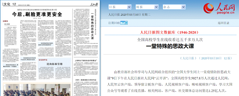 3月9日下午,由教育部社科司与人民网联合组织的“全国大学生同上一堂疫情防控思政大课”通过人民网、人民智云客户端、领导留言板客户端、人民视频客户端、咪咕视频客户端、学习大国公众号等平台如期直播开课。来自清华大学、中国人民大学、北京师范大学和中央财经大学的四位顶级名师在战“疫”特殊时期“云”授课,与广大学子们共同研讨疫情大考告诉了我们什么、战“疫”青年有怎样的责任和担当等话题。“思政大课”反响热烈,据统计,5027.8万人次观看了在线直播,人民网等平台总访问量达1.25亿次。截至3月10日16时,累计回放点播量达3467.7万。这次“思政大课”不仅是疫情防控期间加强高校思政课教学组织工作的重要举措,更为当代思政教育提供新范式,获得高校师生的高度赞誉。