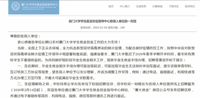 资料显示,厦门大学已发布《厦门大学学生就业创业指导中心致用人单位的一封信》,就毕业生就业手续办理、招聘等事宜,希望用人单位予以充分理解,并适当调整工作安排,尽最大可能满足毕业生求职需求。