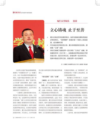 “立德树人是教育的根本任务。我们应当如何来完成这一使命,又怎样走向一流,这是新时代必须要回答好的问题。”校长张荣日前接受《瞭望》新闻周刊专访时表示,走过近百年历程的厦大,始终与国家民族同呼吸共命运,在实现中国梦的伟大征程中,厦大也必将担负起自身的使命职责,不忘初心,为中华民族伟大复兴培养更多优秀的建设者和接班人。