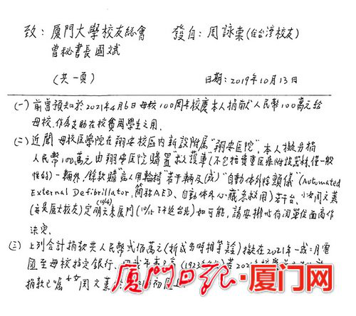 今年10月13日,周詠棠向厦大发邮件,表达将捐款200万元的意愿。次日,其女周文蕙从台北飞来厦门,和厦大对接捐款事宜。