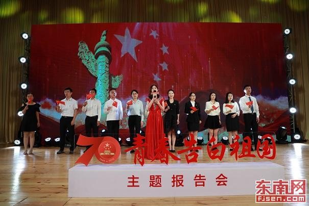 报告会的最后,全场师生手握五星红旗,齐唱《我和我的祖国》,献礼新中国七十华诞。