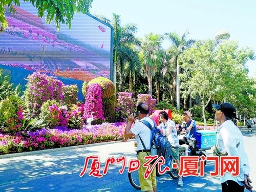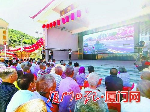 金尚路和莲前西路的T字路口处,不少路人驻足观看——这是厦门日报社旗下的海视传媒金尚路大屏,正在同步转播盛会。中山路步行街、曾厝垵景区、白鹭洲公园等街头巷尾,到处都有驻足屏幕前观看庆祝大会的市民、中外游客。