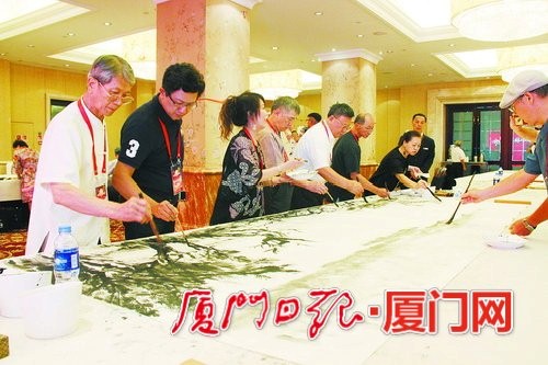 此时,另一个特别的创作也在现场上演。九位台湾画家正用翰墨描绘台湾鳌鼓湿地的景色。台湾画家孟昭光介绍道,通过画台湾的风景体现两岸的交流,同时也体现两岸同文同种。虽然是第一次来厦门,但是这里熟悉的乡音让她感到很亲切,“一个半小时就到厦门,太近了,应该多走动交流。”
