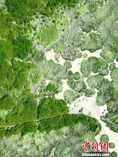 无人机航拍互花米草侵占滩涂、包围红树林的情形。供图
