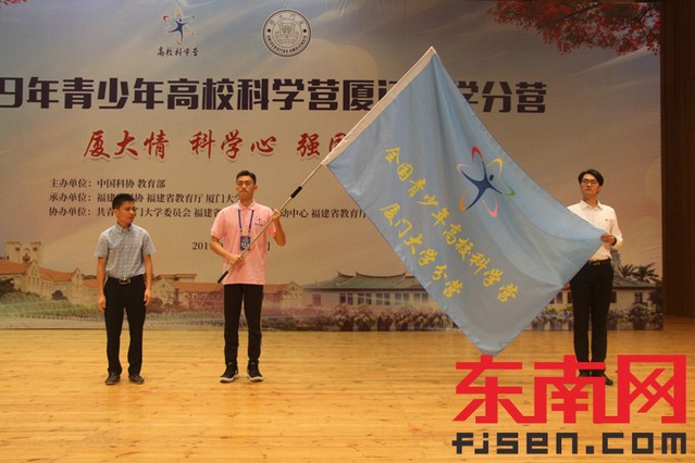 随后,来自沙县一中的曾锐欣同学作为营员代表发言。与会领导共同启动2019年青少年高校科学营厦门大学分营,并由福建省教育厅基础教育处副主任科员魏建龙向营员代表授厦门大学分营营旗。