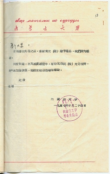 1957年10月,内蒙古大学给厦门大学的感谢信。