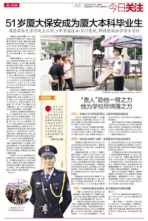 白天学习晚上工作,5年里通过40多门考试,即将获得厦门大学法学学士学位(成人高等教育)。昨日,晚报报道了厦门大学51岁保安周德新的励志故事。报道刊发后,引起了社会的强烈反响。厦门大学微信公号等网络平台纷纷转载,截至今天中午12点,厦门晚报微信公众号和都汇圈微信公众号的相关报道阅读量已超10万,很多网友纷纷表示:敬佩这位年过半百的保安大叔,对知识的孜孜以求、持之以恒的拼搏精神。