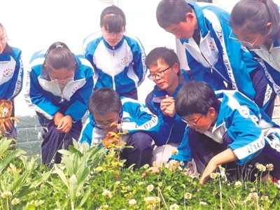 厦门大学支教队老师舒楠(中)带隆德四中学生在绿地识辨生物。