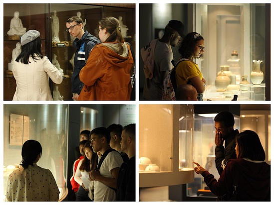 留学生们通过如此详尽近距离的看展,了解了德化陶瓷制作的悠久历史和古代人民烧制陶瓷的方法;更有幸目睹了馆藏珍品-一代宗师何朝宗格调高雅、肃穆大方的代表作;认识了民国时期以五百罗汉瓷雕大群像传世的许友义。“皑如山上雪,皎若云间月”德化窑白瓷艺术品,让别样的美揉合得浑然天成,它的色与形让人一见倾心。
