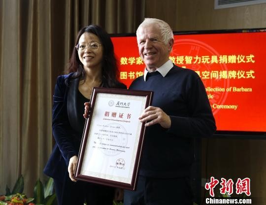 中新网厦门3月30日电 (杨伏山 欧阳桂莲)著名数学家、德国比勒费尔德大学C4教授、挪威皇家科学与文学院院士克劳斯·米歇尔·林格尔(Claus Michael Ringel)伉俪,将毕生收藏的智力玩具及相关文献资料悉数捐赠给厦门大学。30日,林格尔(Ringel)教授智力玩具捐赠仪式在厦大举办。