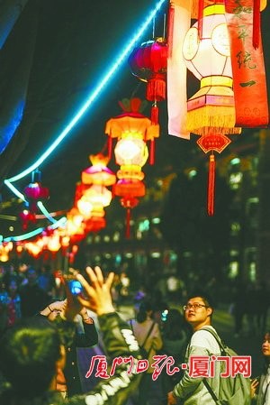 花灯挂满了厦门大学群贤路的科艺广场至三家村广场一段,人潮中不时有学生抬头或回首,被枝头悬挂的花灯吸引了目光。(本组图/本报记者 林铭鸿 摄)
