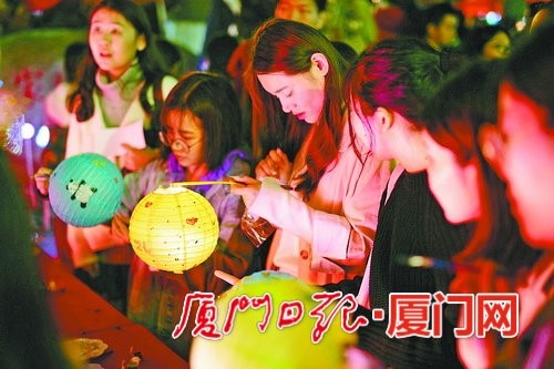 这也是厦大第一次举办元宵灯会,让刚刚开学的学生又惊又喜。晚上七点过后,三家村就人潮涌动,现场不仅有花灯,还有剪纸、踩高跷、舞狮舞龙、猜谜等民俗活动。