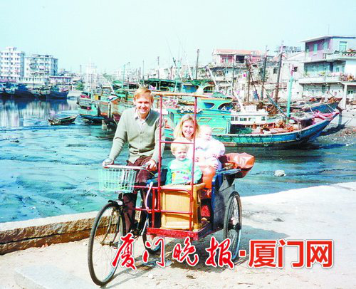 潘维廉早年买了一辆三轮车,骑车带着一家人出游。