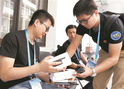 10月13日,蜂语科技团队的拳头产品——数字对讲机即将登上路演现场,队员们在做赛前检查。
