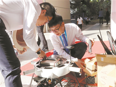 答辩前,南京航空航天大学参赛选手紧张地安装调试自己的展示作品。