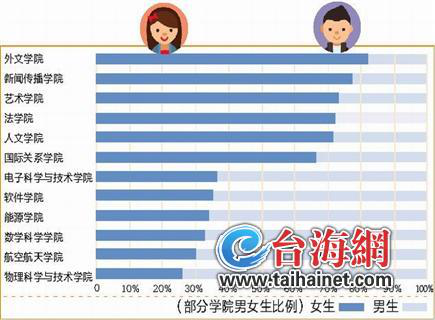 具体到各学院,女生比例最高的是外文学院,女生比例为82.0%;新闻传播学院和艺术学院分别以77.8%和73.8%紧随其后。而男生比例最高的三个学院分别是物理科学与技术学院、航空航天学院与数学科学学院,男生比例分别为71.6%、70.0%和66.3%。