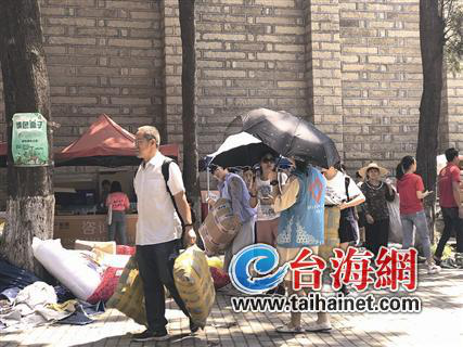 设在厦大思明校区三家村后面空地的快递驿站,大大小小的快递件堆积如山。前来领取快递的新生和家长络绎不绝;负责迎新的大二学生,还借来了三轮推车,一车一车地帮新生搬运。