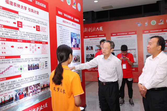 福建省政协副主席、教育厅副厅长薛卫民(中)在厦门大学党委书记张彦的陪同下,参观“青年红色筑梦之旅”活动成果展(赛事组委会供图)