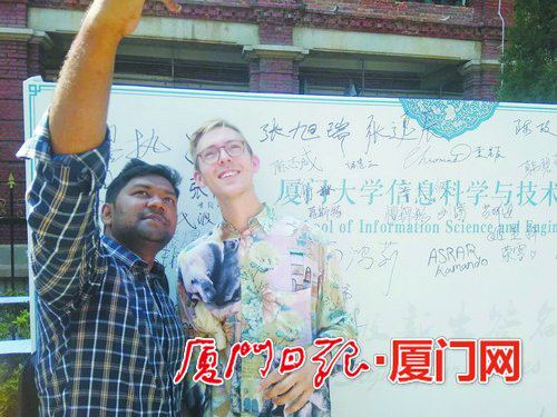 来自瑞典的约翰和来自印度的Suza ur Dola在厦门大学信息科学与技术学院的签到墙前合影留念。 (见习记者 陈雅真 摄)