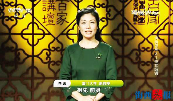 电视上的李菁说起韩愈和侄儿十二郎间的感情,娓娓道来,很有文艺气息。她是继易中天、傅小凡之后,第三位登上央视《百家讲坛》的厦大老师。