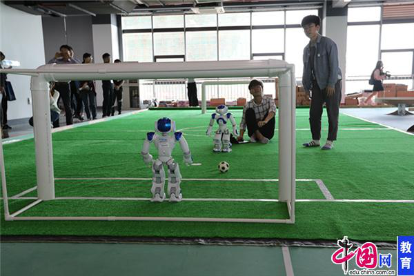 RCS机器人队的两位成员正在对机器人射门进行调试,为参加2018中国机器人RoboCup公开赛作准备。(张劲松/摄 谢沂楠/文)