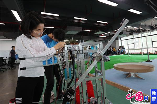 厦门大学飞行器系学生正在对机器人的结构进行设计,并解决机器人在测试中出现的问题。(张劲松/摄 谢沂楠/文)