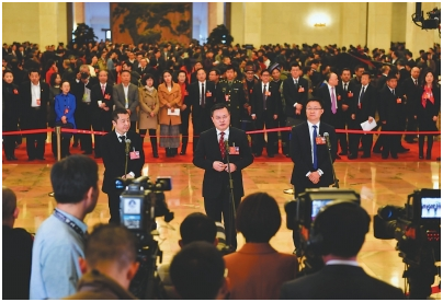11日14时05分,人民大会堂中央大厅北侧,十三届全国人大一次会议“代表通道”第三次开启。