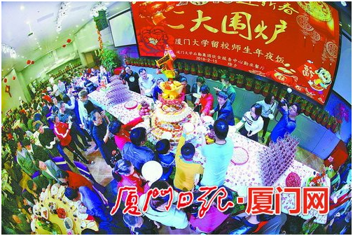 本报讯(记者 佘峥)全市最大的围炉在厦大。厦大昨天为留校的1300多名学生和他们的家人准备了三个校区共170多桌年夜饭,还有用200多个鸡蛋做成的三层大蛋糕。