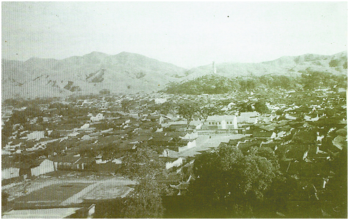 当时长汀县城全景,厦大校舍散落于长汀北山麓。
