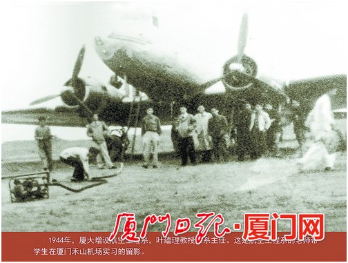 1944年,厦大增设航空工程系。图为航空工程系的老师带学生在厦门禾山机场实习的留影。